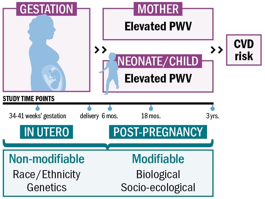 Pregnancy is an opportunity to screen women at high-risk for cardiovascular disease so that prevention strategies can be implemented. Arterial stiffness measured by pulse wave velocity is a marker for cardiovascular disease risk. This study enrolls mother-infant pairs from healthy pregnancies and those complicated by adverse perinatal outcomes to measure maternal and infant arterial stiffness by pulse wave velocity and cardiovascular biomarkers. We will longitudinally estimate cardiovascular disease risk in healthy and medically complicated pregnant women and their infants from birth to three years postpartum.